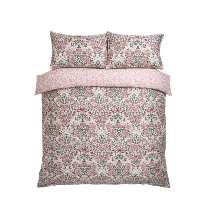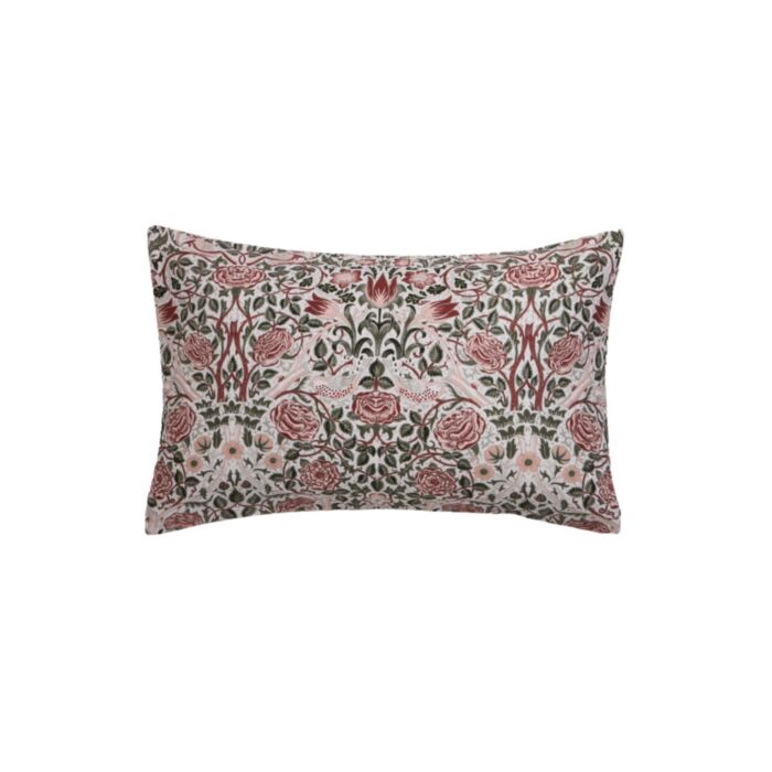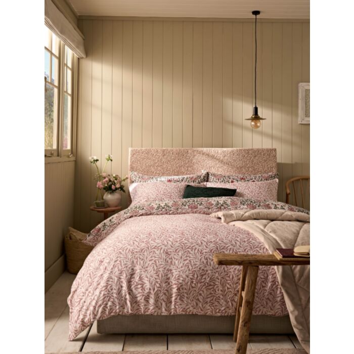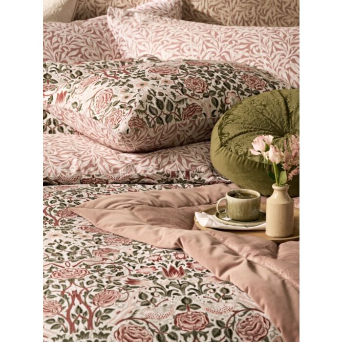 沉浸於這款來自威廉莫里斯美術館館藏的歡快設計之中。這款名為「玫瑰」的圖案由威廉莫里斯於1883年設計,最初用作家具布料。如今,它被印製在這款奢華柔軟的220支紗棉緞床品上,精美地描繪了鬱金香、玫瑰花頭和靈動的鳥兒,並以溫暖的陶土粉、赤陶色和鼠尾草綠為主色調。床品背面則飾以威廉莫里斯標誌性的「柳枝」圖案,採用優雅的磚粉色,為您的臥室增添一抹精緻優雅的氣息。