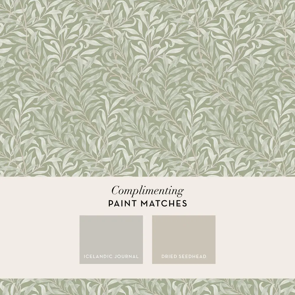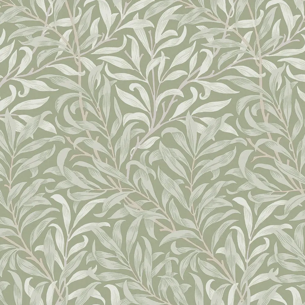 這種標誌性圖案是畫廊早期印花棉布和壁紙系列收藏的一部分。設計基於天然柳樹形狀,這是威廉莫里斯最喜歡的圖案之一。它最初由威廉·莫里斯(William Morris) 於1887 年設計為壁紙,並於1895 年改編為織物,在默頓修道院(Merton Abbey) 印刷成對角樹枝圖案,將抽象與對戶外的溫柔提醒融為一體。柳樹枝鼠尾草營造出一種優雅的氛圍,拖尾葉子呈現柔和的灰白色、淺灰色和鼠尾草色,背景為柔和的淺橄欖色。這款霧面壁紙營造出平靜而古樸的感覺,使其成為任何家庭的可愛點綴。